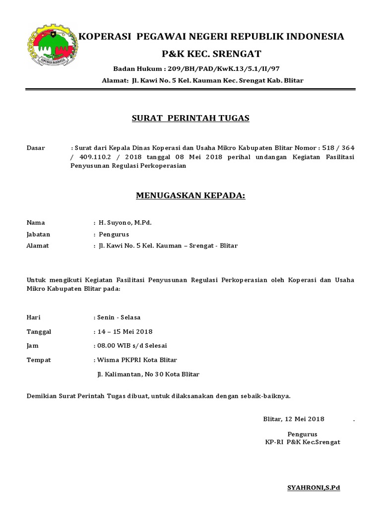Contoh surat perintah tugas koperasi. 1 Kecamatan Sukarame Kabupaten Lampung. Guru yang merupakan bawahan dari seorang kepala sekolah tentu mungkin saja diperintahkan untuk menjalankan tugas tertentu. Yang bertanda tangan di bawah ini Kepala Sekolah Menengah Kejuruan SMK Negeri 1 Sukabumi Kecamatan Sukarame Kabupaten Lapung menyerahkan tugas.